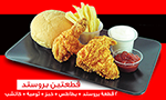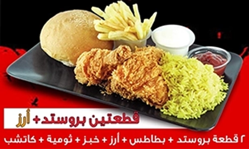 قطعتين بروستد + بطاطس + خبز +ثومية +كاتشب + أرز