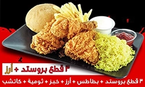 ثلاثة قطع بروستد + بطاطس + خبز + ثومية +كاتشب + أرز