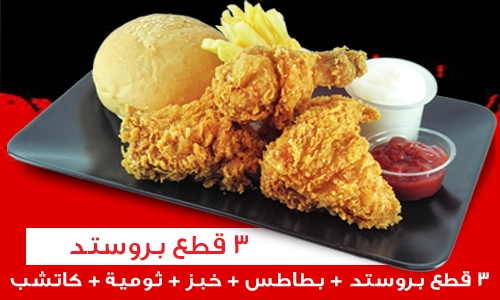 ثلاثة قطع بروستد + بطاطس + خبز + ثومية +كاتشب