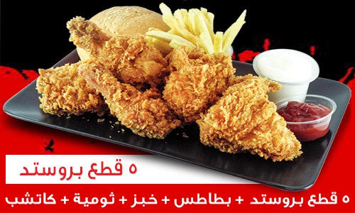 خمس قطع بروستد + بطاطس + خبز + ثومية + كاتشب