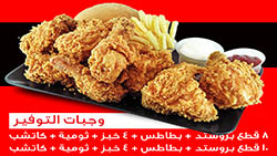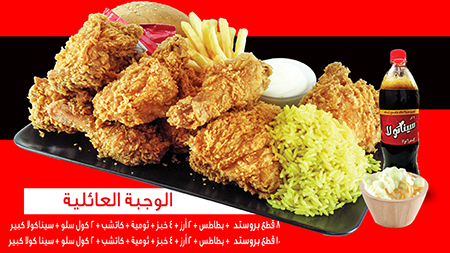 ثمانى قطع بروستد + بطاطس + خبز + ثومية + كاتشب + أرز + كول سلو +كولاكبير